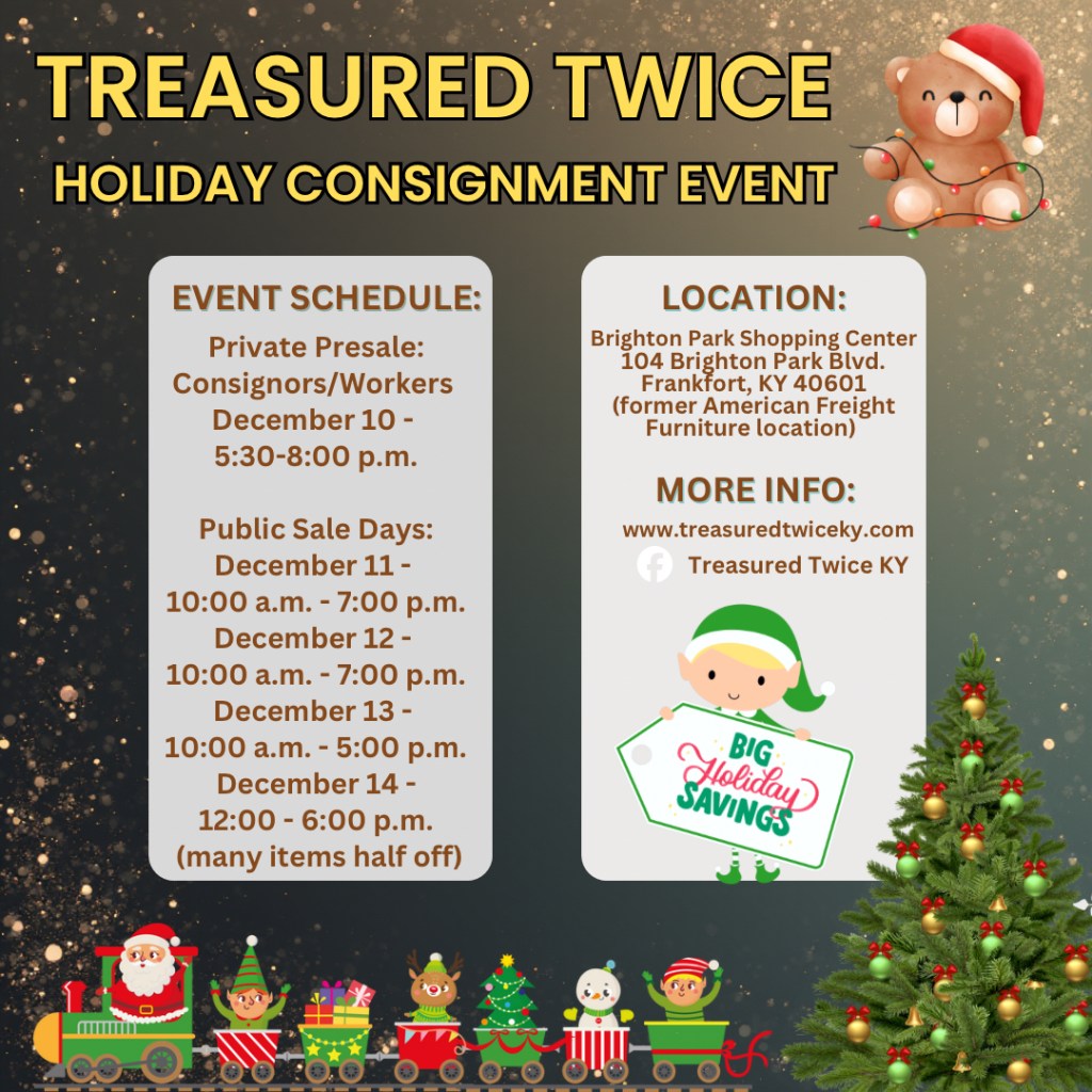 Treasured Twice holds consignment events in central Kentucky offering new and gently used clothing, shoes, toys, books, electronics, sports equipment, furniture, home goods, and more. Consignors price their items using an online software system, and Treasured Twice promotes the events and sells the items. Shoppers can expect to find high quality inventory at bargain prices.